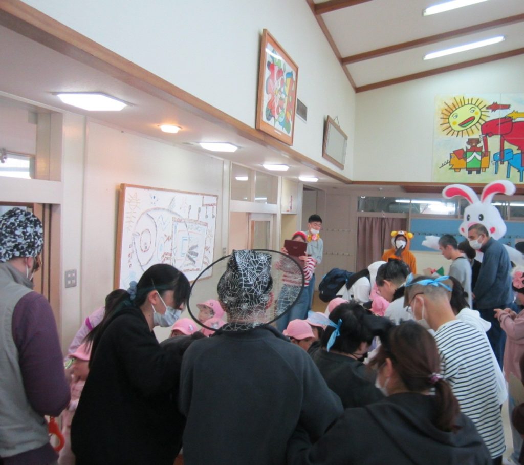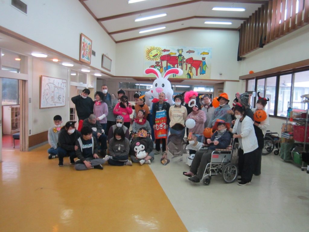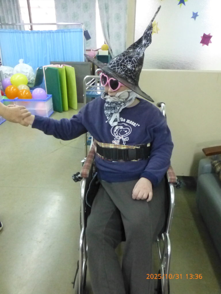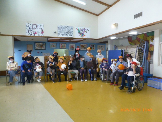 令和7年10月31日に光の園のハロウィンイベントが行われました。利用者さんはゲームをしたりして楽しんでいらっしゃいます。午後のは、こども園のお子さん方々がいらして、お菓子を配るために、利用者の方が思い思いの仮装でお出迎え致しました。